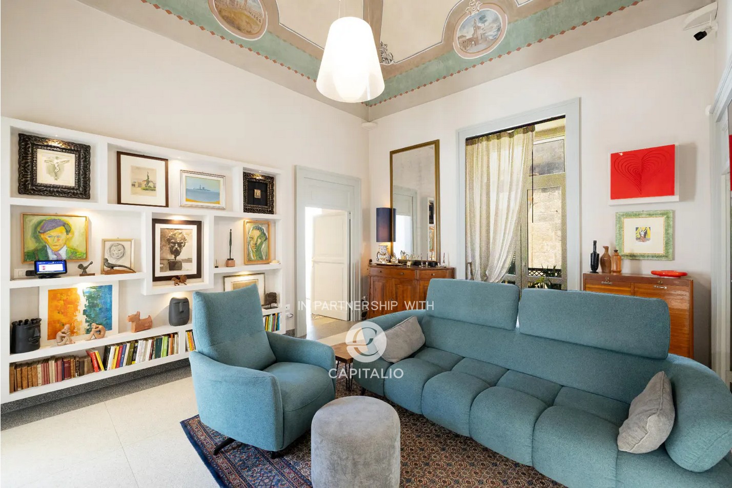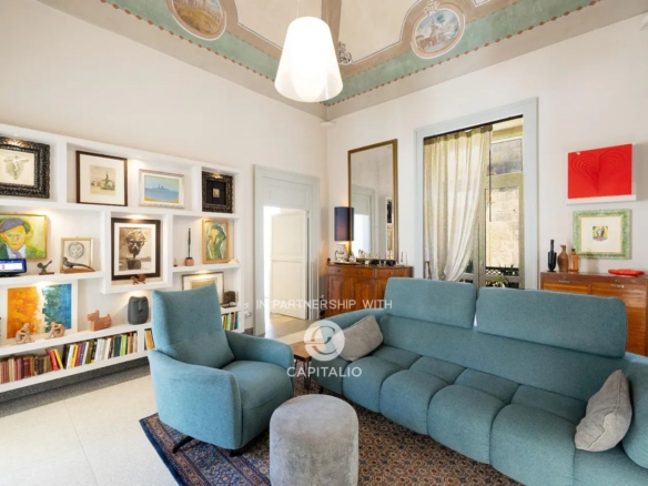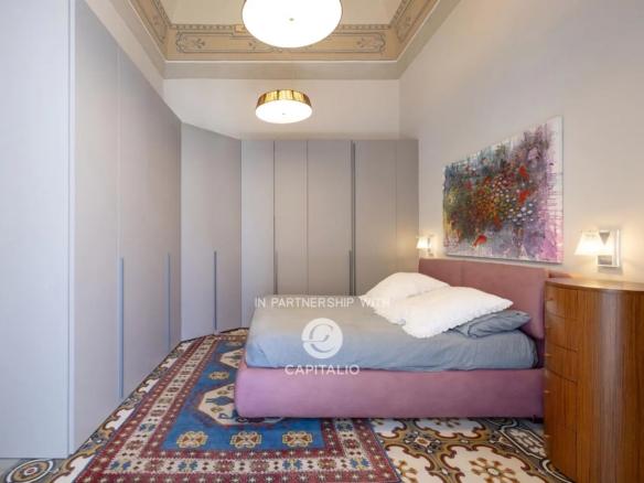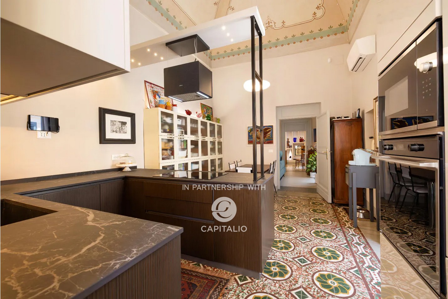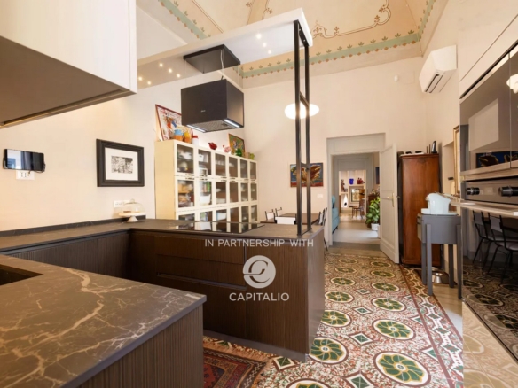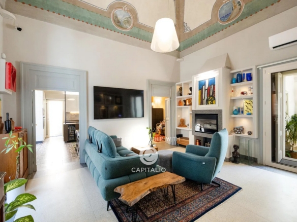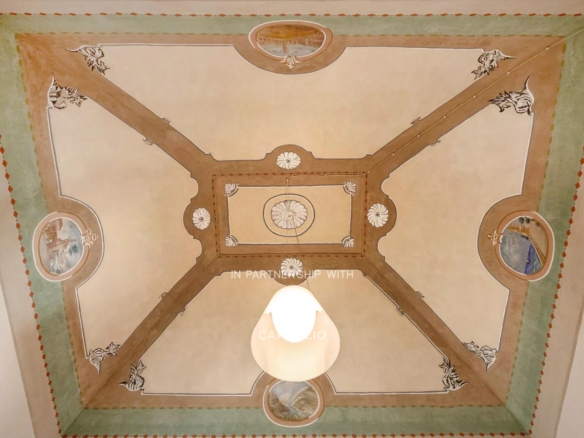 From an arcade with high star vaults, you enter the apartment; a treasure trove of beauty…star-vaulted ceilings with frescoes, vintage cement tiles covering the floors, original interior fixtures that have been refurbished, and large French windows opening onto three elegant balconies. The apartment offers history, art, and modern comforts.