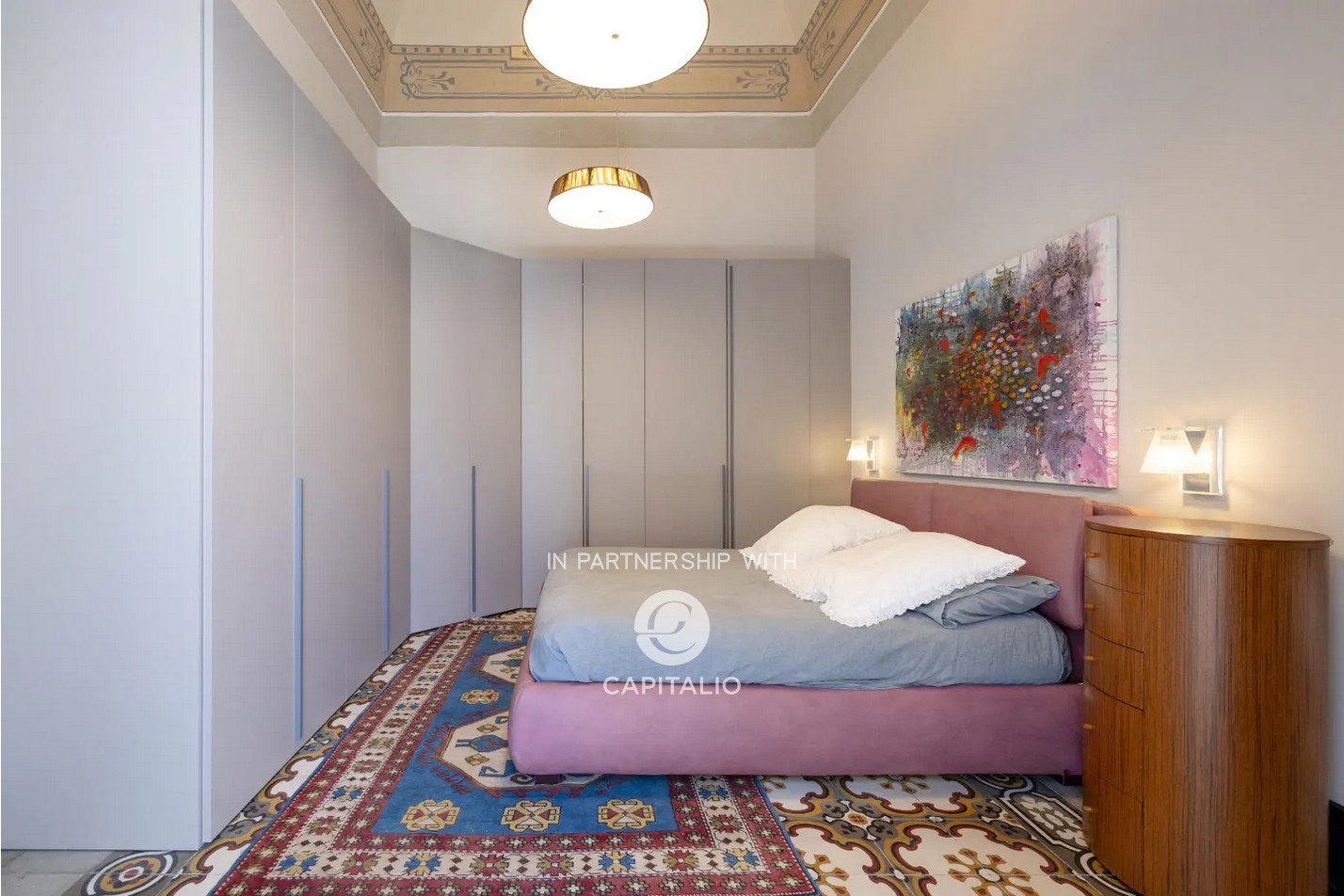 The large and bright master bedroom, with frescoed ceilings, cement tiles, and designer chandeliers, opens onto a comfortable flower-filled balcony.