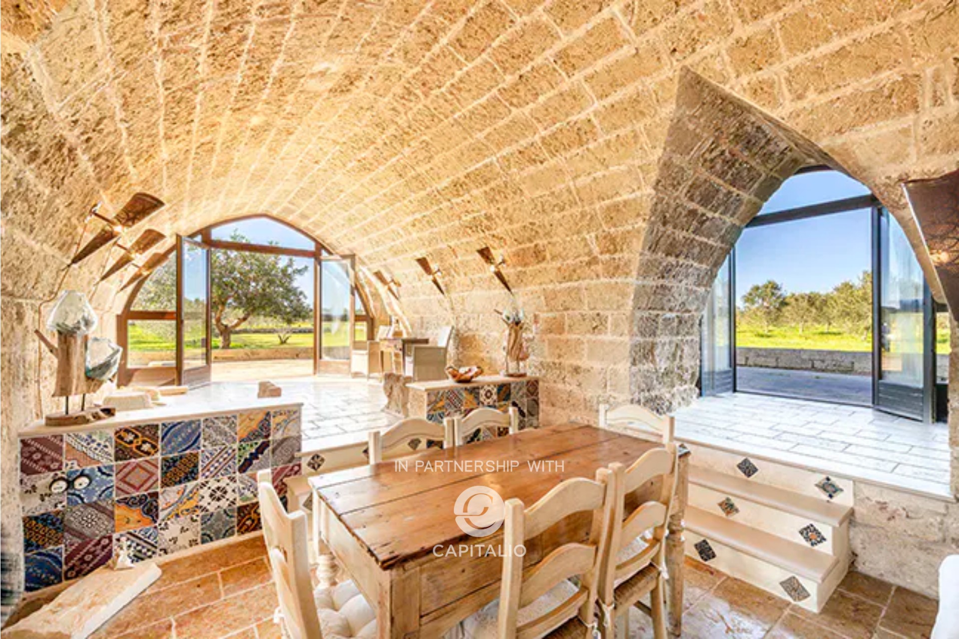 Each room opens onto the terrace surrounding the house, thanks to arched glass windows that create perfect continuity between indoor and outdoor spaces.