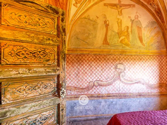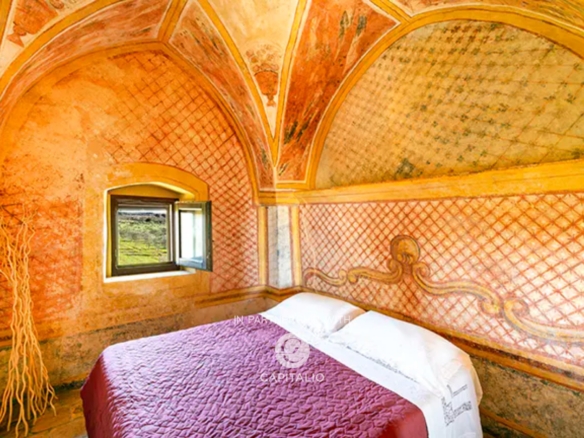 The sleeping area houses two fully frescoed bedrooms, brought to light during the renovation works, ancient 17th-century tiles, and a view of the olive grove.