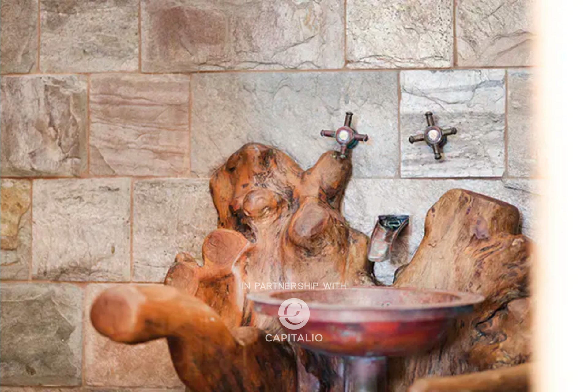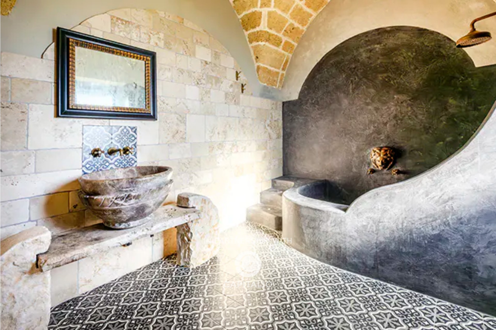 Serving the ground floor is a bathroom complete with a shower, finished with lava stone, Indian slate, brass, and olive wood finishes.