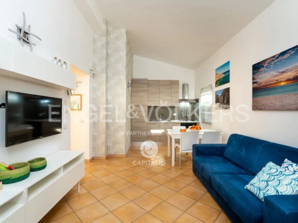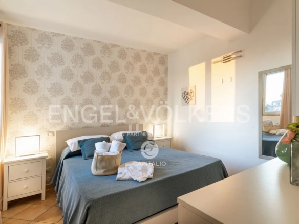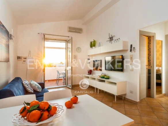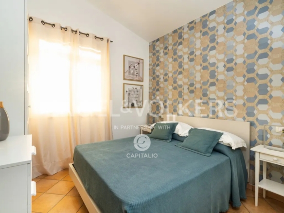 The Fillide apartment is about 100 sqm and belongs to the exclusive Anny Residence, which is located a few steps from the beautiful beach of San Lorenzo. This lovely sea view apartment has been recently renovated. It has modern style furniture with a minimal design. The flat occupies the first floor and consists of a large living-dining room with sofa bed, cooking area, two bedrooms and two bathrooms, one of which is located between the two bedrooms and the other on the ground floor, that you can access via the external staircase. This staircase also leads from the private garden directly to a spacious veranda with pleasant sea view, to enjoy the coolness of the evening, while relaxing at home. The flat lends itself to be used both as an investment in the circuit of holiday homes and for personal use, representing the optimal solution for those who are looking for a quiet place, not far from the main local touristic attractions