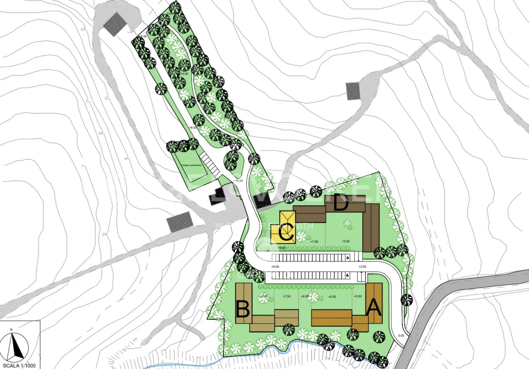 The project shows a careful attention to greenery, with a large presence of trees and landscaped areas surrounding the complex, improving the quality of life and visual impact. The proximity to a watercourse and the presence of pre-existing vegetation indicate a sustainable approach that respects the local ecosystem.