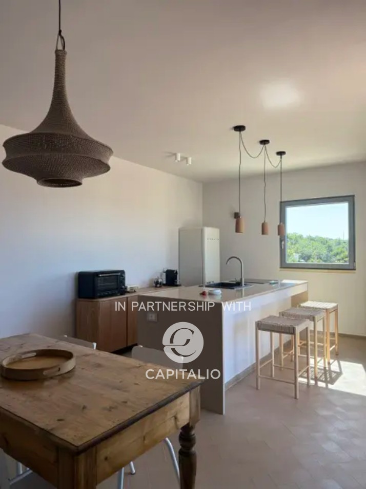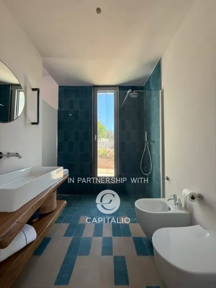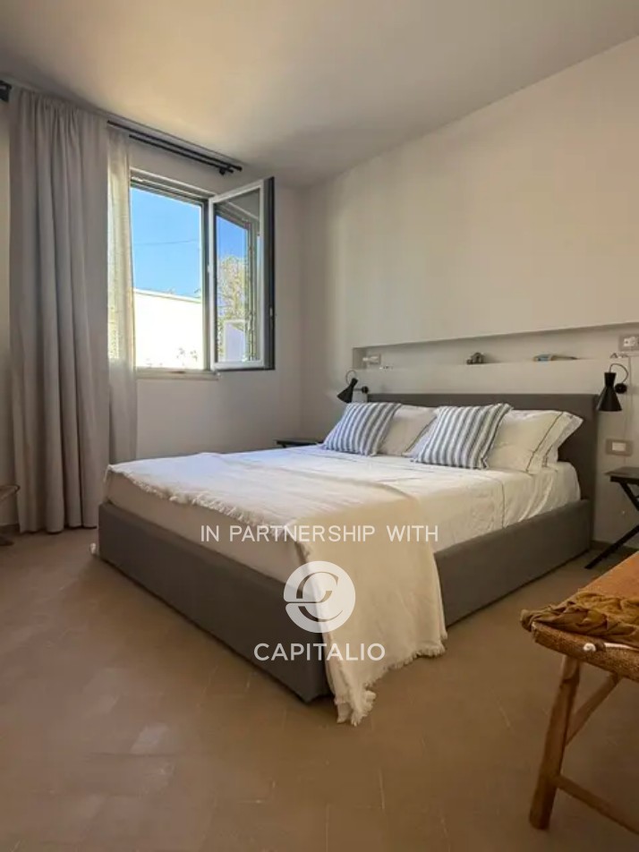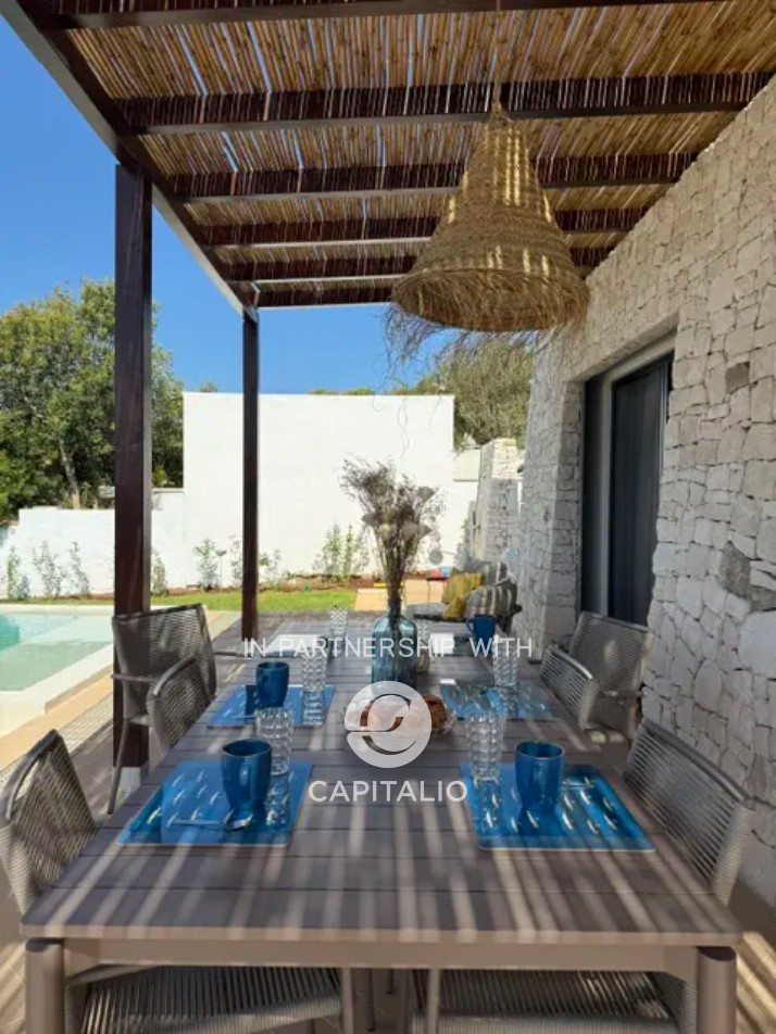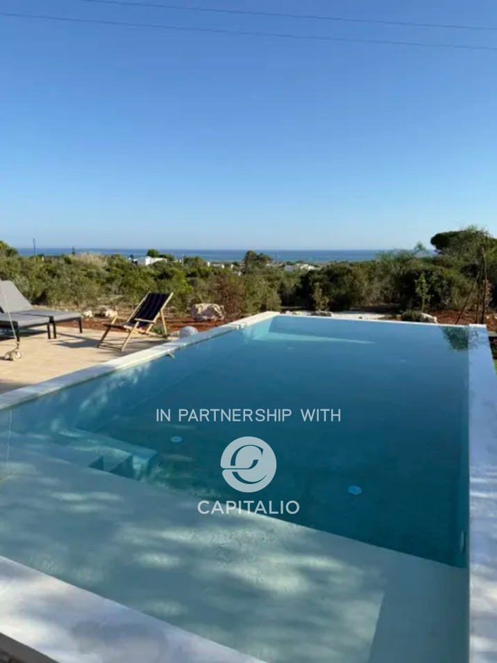 Villa Corten is an example of modern design, in harmony with its surroundings. In a dominant and tranquil position, in Torre Pali of Salve, it extends over almost 100 square meters of surface, on a plot of 2500 square meters and enjoys a spectacular view of the sea and the beaches of Pescoluse, which are less than a kilometer away. It was completed in 2024 with high-quality finishes, including external paving in Lecce stone and walls in natural stone, creating a warm and refined atmosphere, perfectly in tune with the landscape. The interior is characterized by spacious, bright areas, with a convertible living room that can adapt to various needs. The open-space kitchen is well integrated with the living room, creating a fluid and welcoming environment. It has a double bedroom and two bathrooms, one of which is en suite. The sea view at sunset can also be enjoyed from the 30 sqm infinity pool, located in a privileged position that seems to blend with the horizon, offering a unique relaxation experience. The corten effect of the gate, fixtures, and pergola seems extracted from the red of the garden’s earth, in a harmony of colors, enhanced by the white tones of walls and stones. The outdoor area is ideal for moments of outdoor leisure, which can continue on the terrace, where the view becomes iconic. From the sunset over the sea onward, the colors become magnificent, thanks to the lighting that enhances the exterior. The fixtures are thermal break, and the fittings are iron. Heating and cooling system with heat pump. Cistern for running water storage and sewage with sub-irrigation system. Solar panel for hot water. It is the perfect refuge for those seeking an exclusive, new, and ready-to-use residence, immersed in rurality, with a panoramic view.